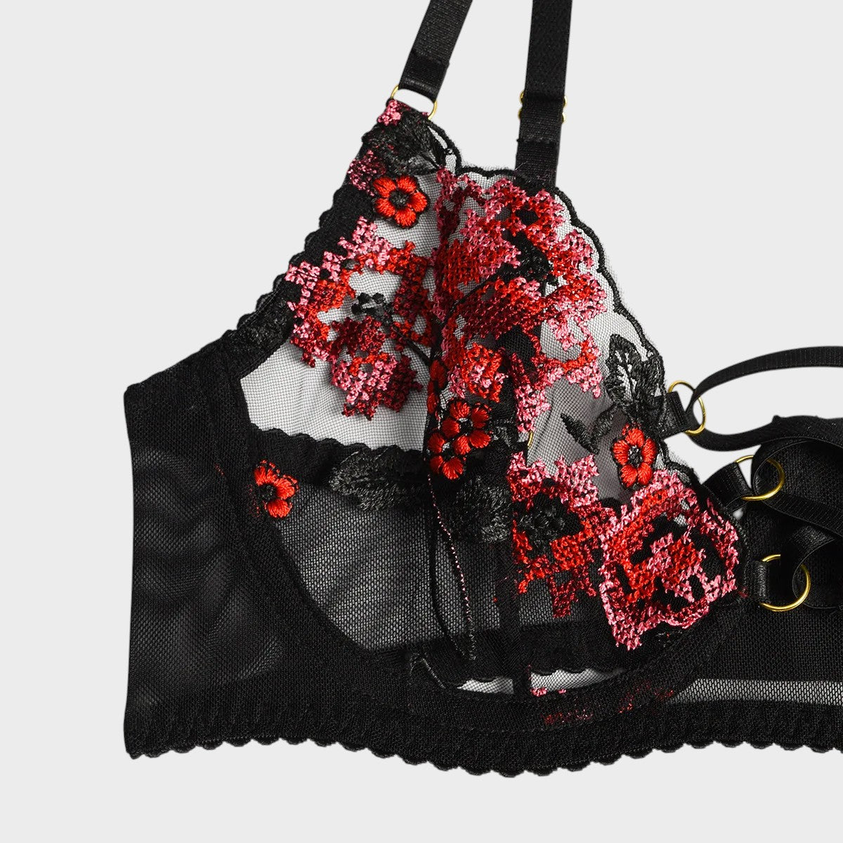 התחתונים התואמים עשויים מאותו חומר תחרה ורשת אלגנטי ומציעים חיתוך מחמיא המדגיש את הקימורים שלך. עם כיסוי מינימלי, הם מדגישים את המראה הסקסי הכללי של הסט, מה שהופך אותם לתחתונים סקסיים לנשים אידיאליים.